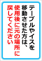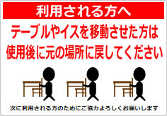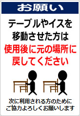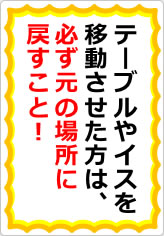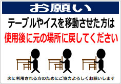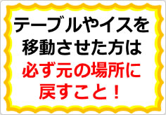 テーブルやイスを移動させた方は、使用後に元の場所に戻してくださいの貼り紙の使用例