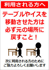 テーブルやイスを移動させた方は、使用後に元の場所に戻してくださいの貼り紙