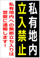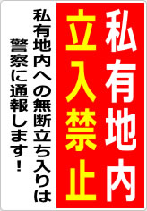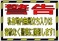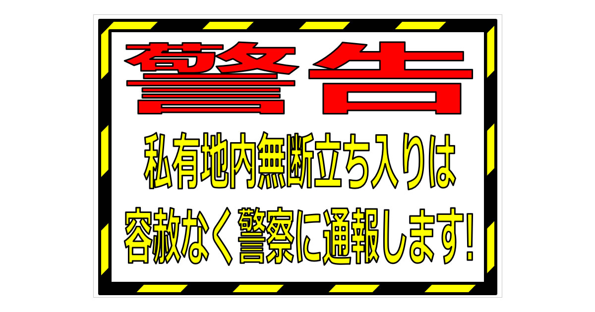 私有地への無断侵入を防止するための強い警告を示すものです。敷地内に許可なく立ち入った場合、警察への通報や法的措置を取る可能性があることを明記することで、抑止力を高めます。住宅地、工場、倉庫、農地など、外部からの侵入が問題となる場所での使用に適しています。安全確保やプライバシー保護の観点からも重要な掲示です。