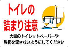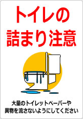 トイレの詰まりに注意を促すための表示です。「大量のトイレットペーパーや異物を流さないようにしてください」という具体的な注意文を追記したバージョンもあり、利用者のマナー向上と設備保護を目的としています。施設内のトイレ入口や個室内に掲示することで、トラブルの未然防止に役立つ素材です。