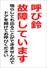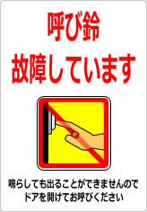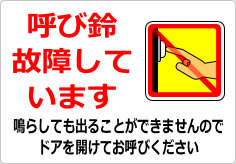 施設や住宅の呼び鈴が故障していることを明示し、来訪者に対して代替の呼び出し方法を案内するための表示です。「鳴らしても出ることができませんのでドアを開けてお呼びください」という追記文があるバージョンもあり、状況に応じて使い分けが可能です。店舗や事務所、集合住宅などでの一時的な案内に活用され、来客対応の混乱を防ぐ素材です。