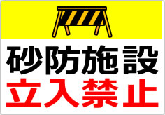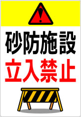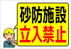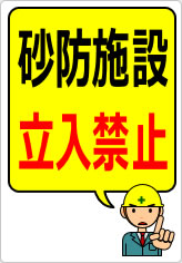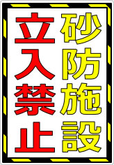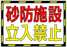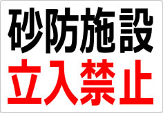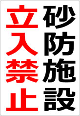 砂防施設であることを明示し、関係者以外の立ち入りを禁止するための注意表示です。山間部や河川敷などに設置された砂防ダムや治水施設は、安全確保のため一般の人が立ち入ることができません。誤って侵入することを防ぐため、視認性の高い貼り紙を掲示することで、事故やトラブルの未然防止に役立ちます。自治体や管理団体からのリクエストに応じて制作されたもので、公共安全に貢献する素材です。
