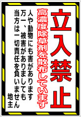 全文以下の通りです。「立入禁止 高濃度除草剤を散布しています 人や動物にも害があります 万一、被害がありましても 当方は一切責任を負いません 地主」。