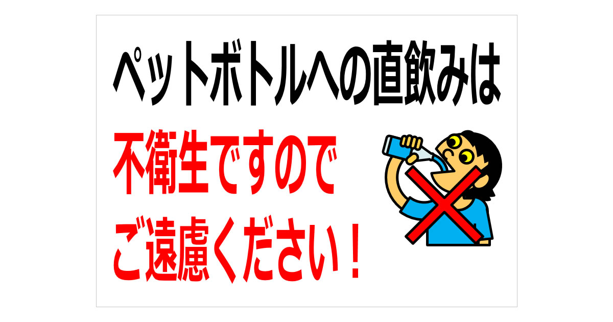 ペットボトルへの直飲みは不衛生ですのでご遠慮ください!の三角スタンドです。PDF版とパワーポイント版を提供しております。そのままでも、文字を編集してでもご利用いただけます。