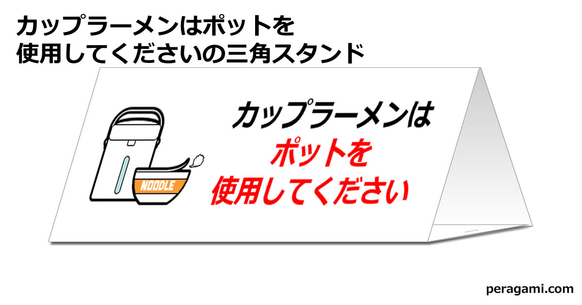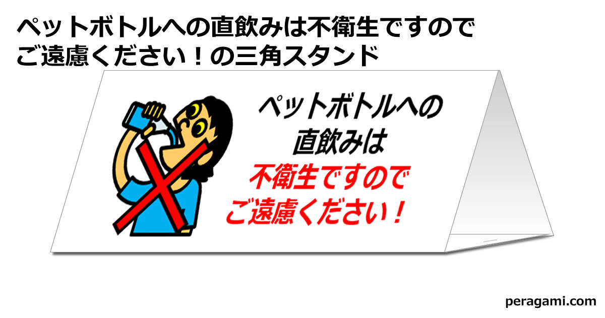 ペットボトルへの直飲みは不衛生ですのでご遠慮ください!の三角スタンド印刷サンプル(A4サイズ縦向き)