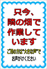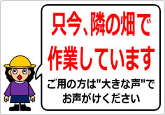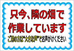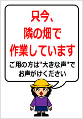 「只今、隣の畑で作業しています。ご用の方は"大きな声"でお声がけください」と2パターンあります。