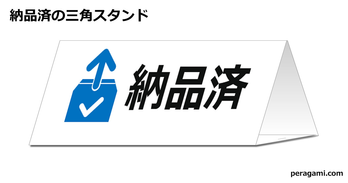 納品が完了した商品や資材の置き場に設置する三角スタンドです。現場で納品状況を明確に示し、次の工程(検収・設置など)へスムーズに移行できます。納品書番号や納品担当者を記載しておくと管理が簡単です。