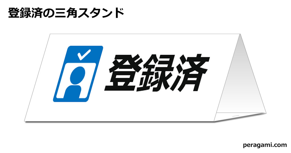 登録手続きが完了した書類やデータ媒体に置く三角スタンドです。受付カウンターや事務所内で、処理済みのものを一目で識別するために使います。登録日や登録番号を併記すると追跡が容易です。
