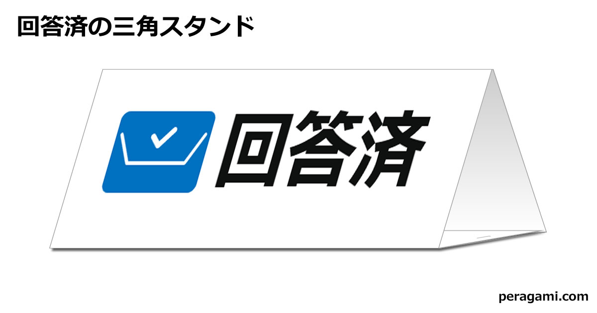 問い合わせや依頼に対して回答済みであることを示す三角スタンドです。窓口やデスク上で使用し、未回答の案件と区別して業務の流れを可視化します。回答日や担当者名を記載しておくと後続対応がスムーズです。