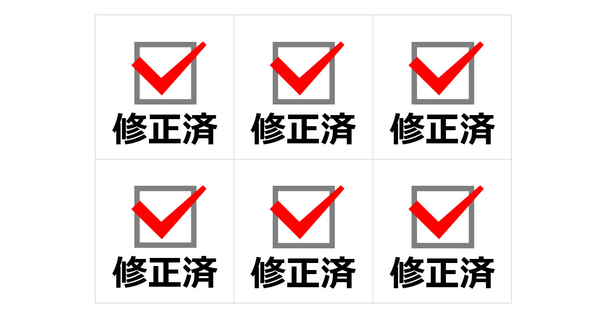 文書や図面、製品などの修正作業が完了したことを示し、最新版管理や差し替えの指示に利用できます。