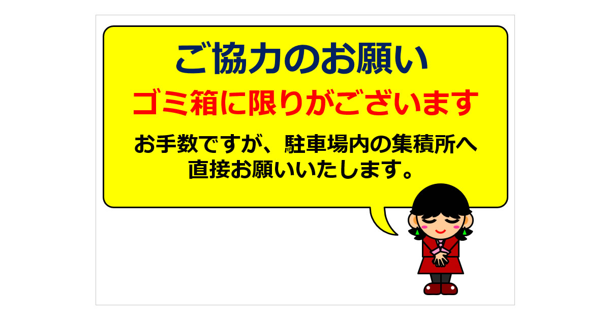 全文以下の通りです。「ご協力のお願い ゴミ箱に限りがございます。お手数ですが、駐車場内の集積所へ直接お願いいたします。」。