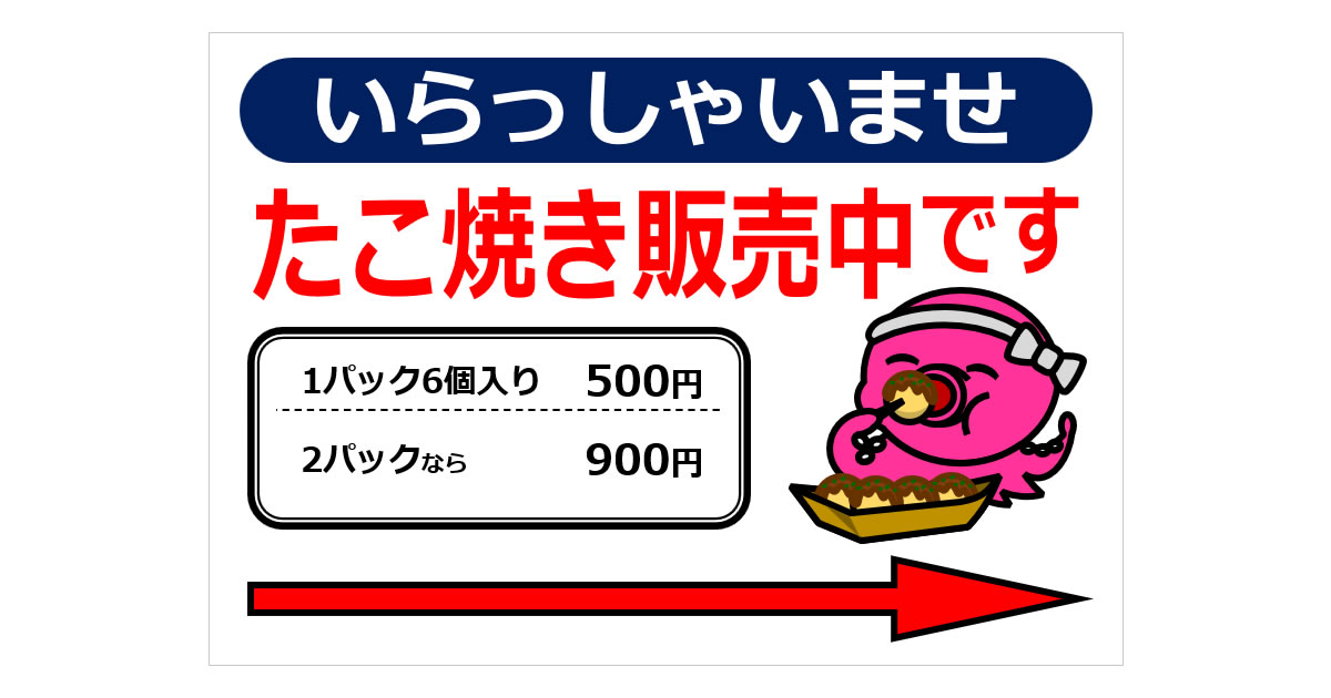 たこ焼き販売中です+矢印の貼り紙ダウンロード